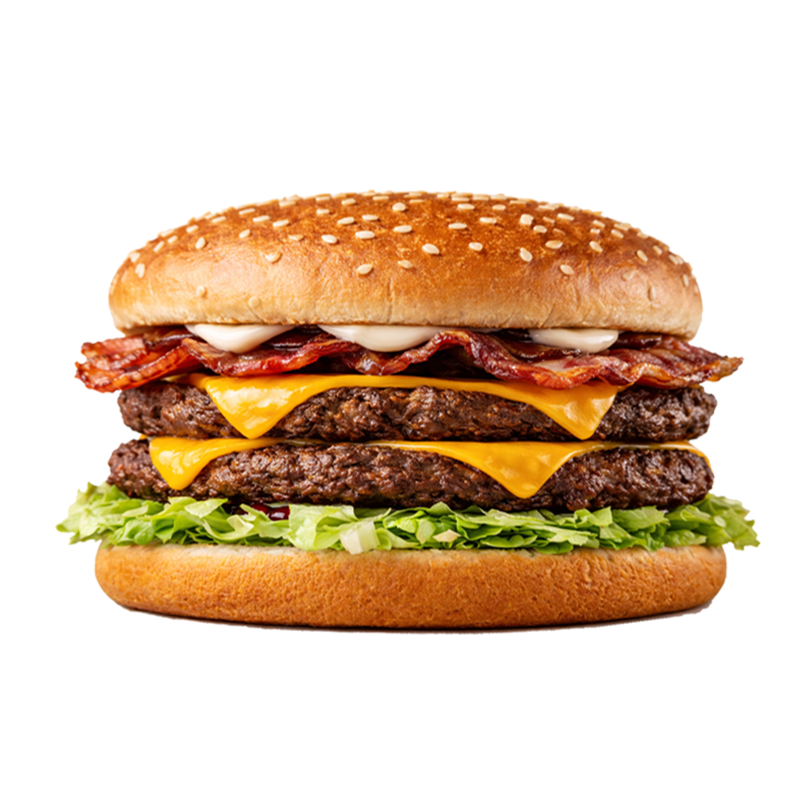 Pão com gergelim, 2 hamburguer de carne 100% bovina, queijo cheddar derretido, bacon em tiras, molho especial e alface.